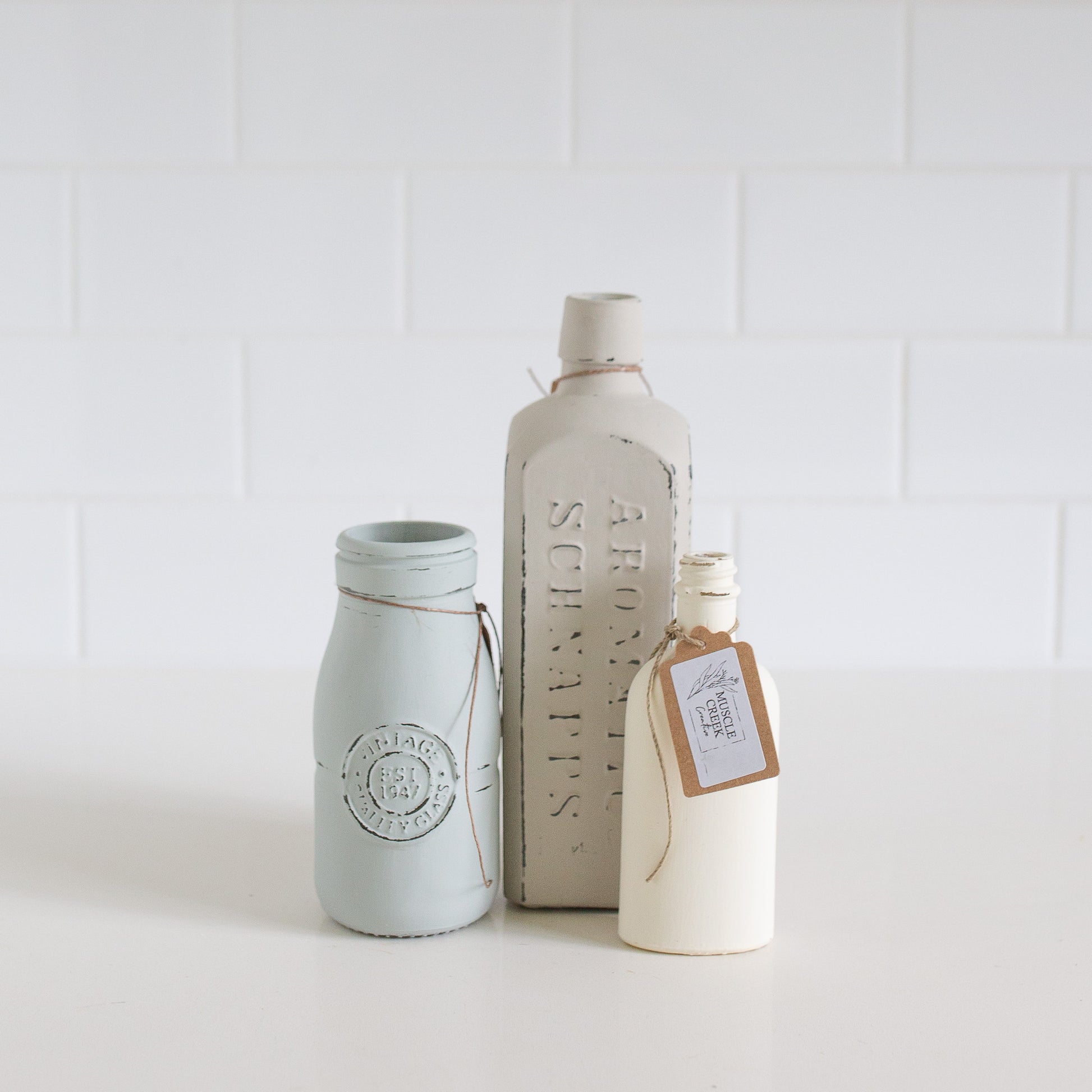 Beautiful set of 3 vintage bottles painted in our mushroom greige, a pale blue and doily white Chalk Paints.