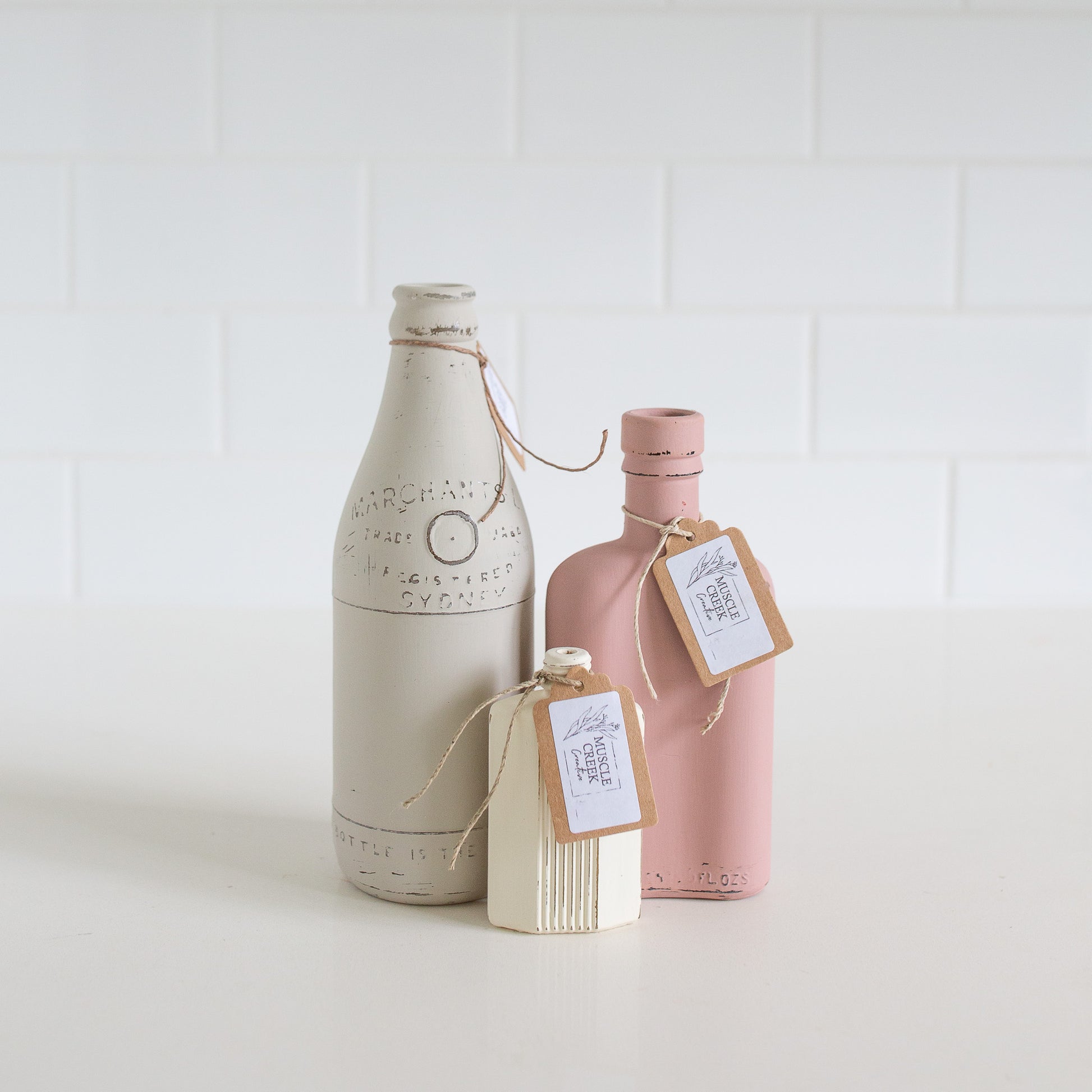 Beautiful set of 3 vintage bottles painted in our mushroom greige, a custom pink and doily white Chalk Paints.